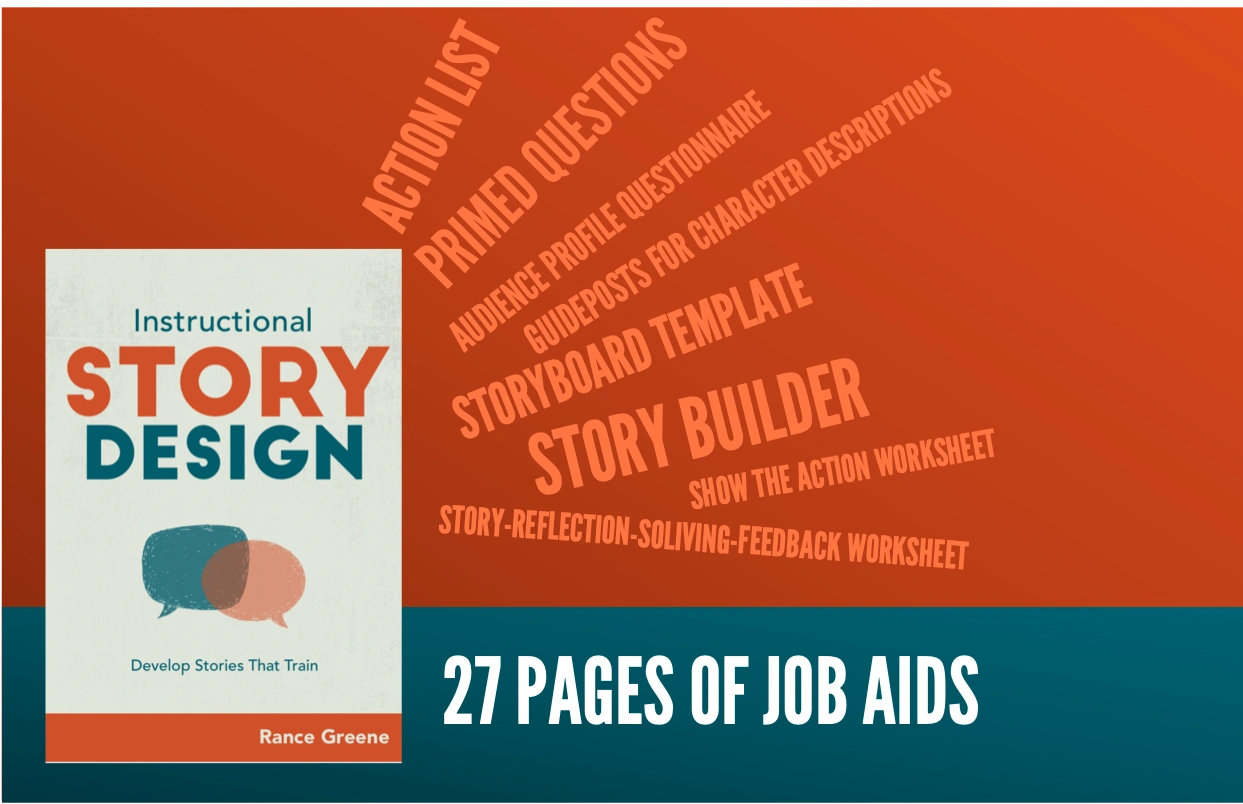 Each step in the Story Design model is supported by robust job aids, worksheets and a complete Instructional Story Design Plan. When you purchase the book, you also get access to editable downloads of these resources.